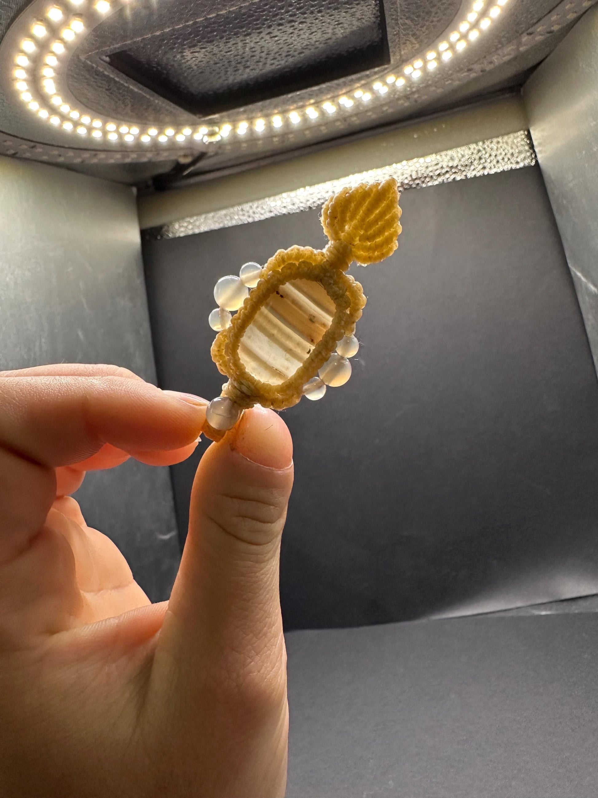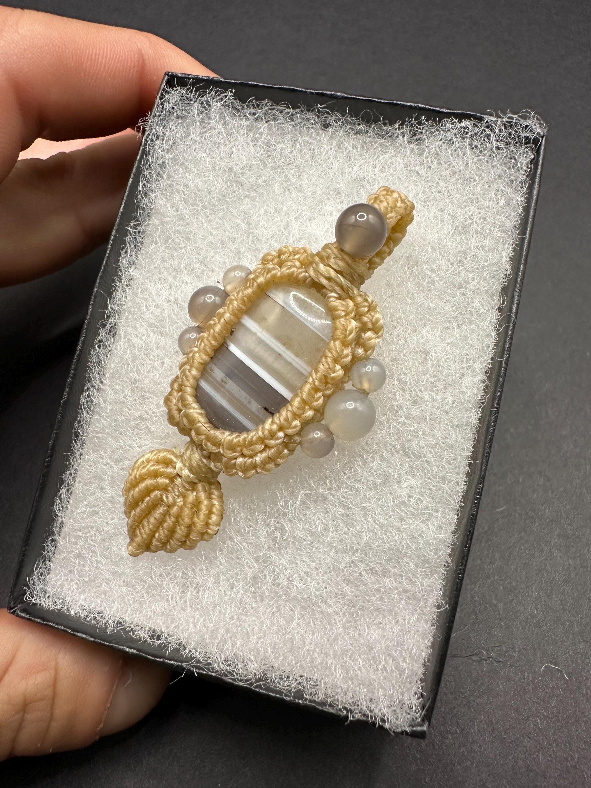 This macrame pendant is handmade with love. The stones are very carefully and mindfully chosen to provide a nice balance in color, and aesthetics. This pendant has a lovely macrame leaf adding a very "royal" vibe.