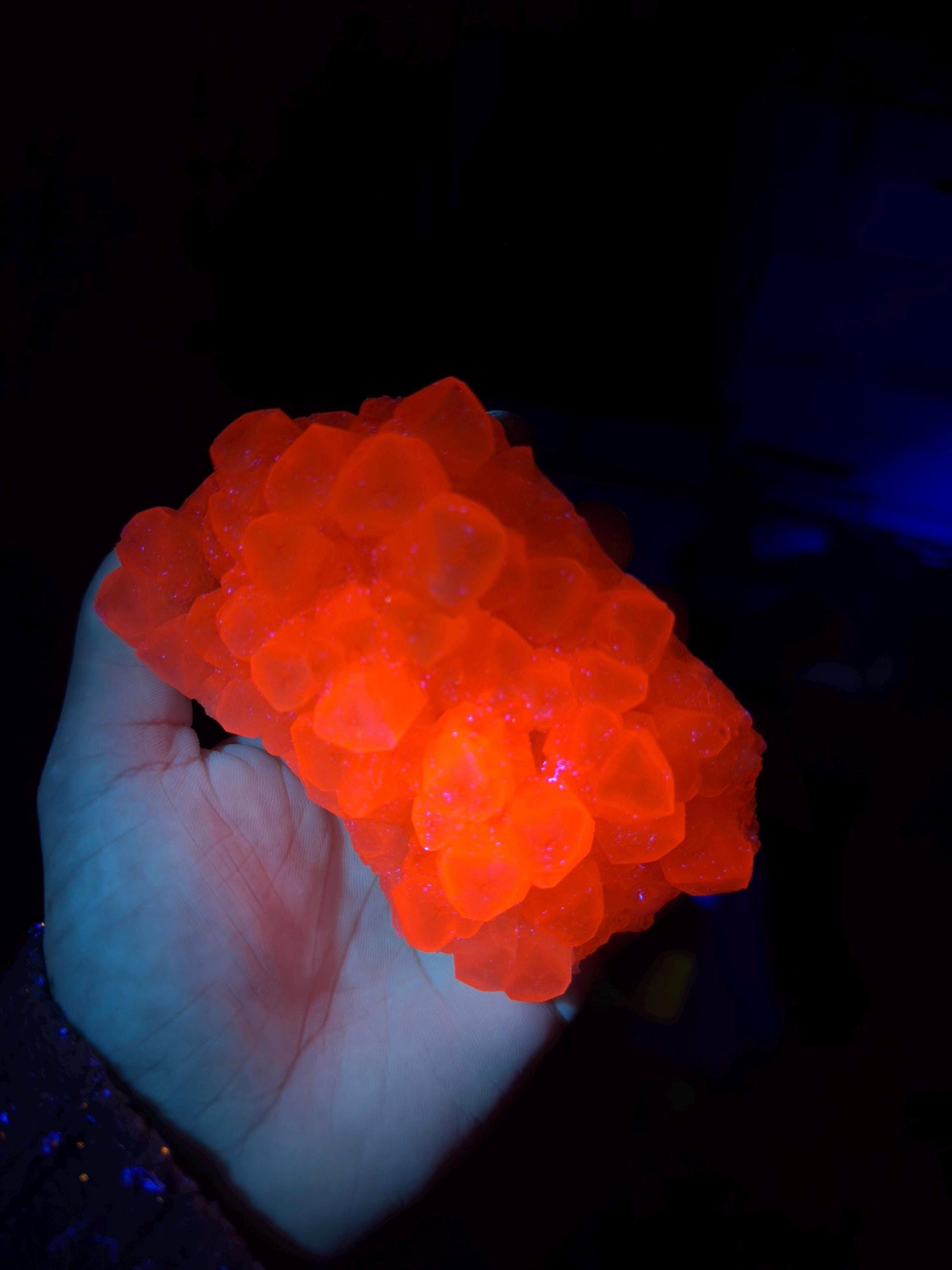 These Columnar Calcites are seemingly new on the market. Upon doing lots of research, I could not find any Calcite specimens even comparable to these. These Calcite clusters are from Longyan, Fujian Province, China. They heavily fluoresce a very beautiful vibrant pink color. They also have these super aesthetic triangular centers that make the specimen absolutely POP under UV as well as in normal light. These specimens were acquired from a lady whose father was a well-known geologist in many provinces in China and had connections with the mines in many areas. She was seriously the sweetest lady ever! We are excited to add these to our inventory and provide you all with a chance to acquire one of these amazingly unique specimens for your collection.