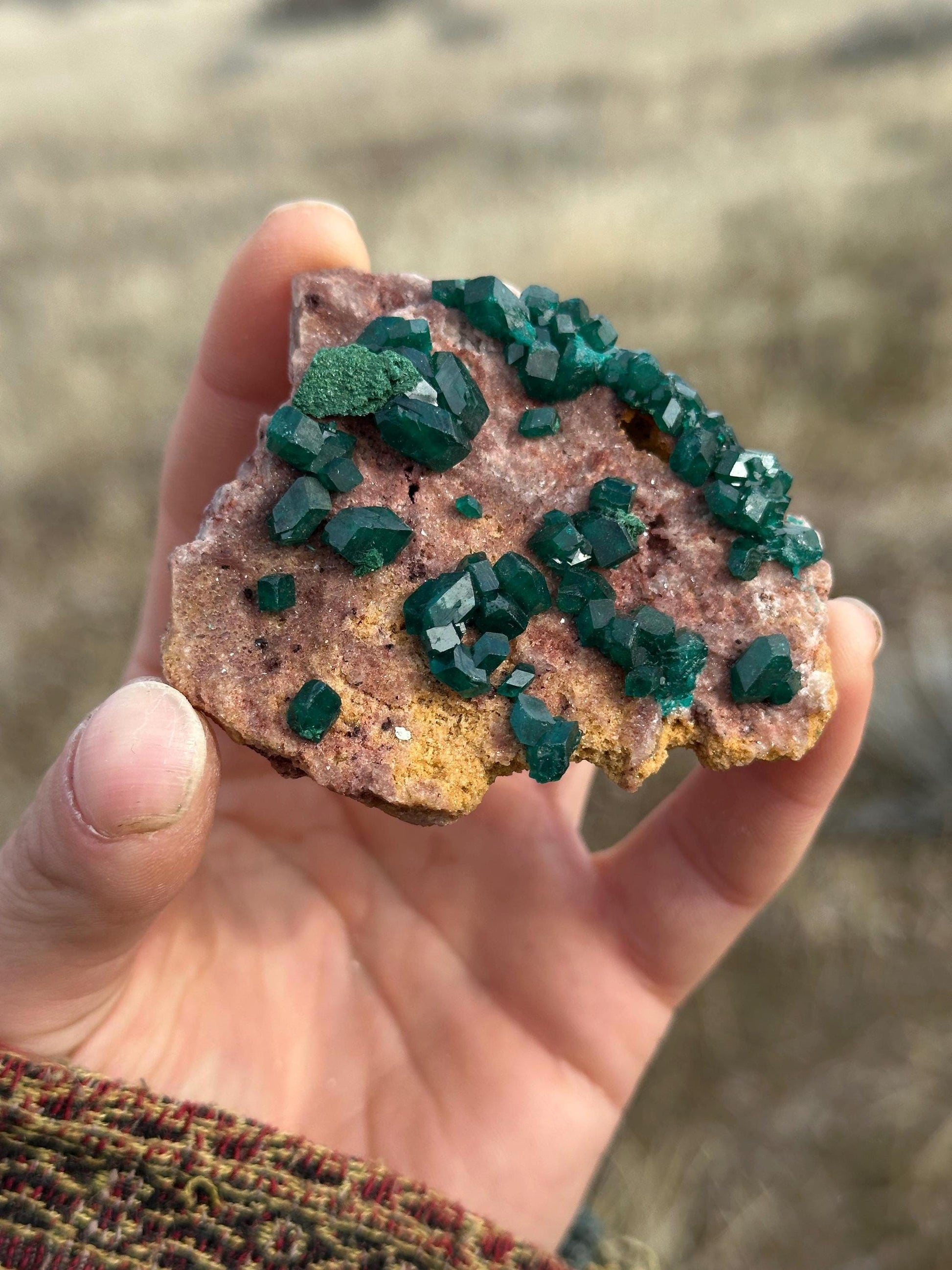 This is a really great specimen of vibrant Dioptase on matrix. Being “on matrix” simply means that it is still on the host rock. This type of specimen can be very desirable amongst collectors. Dioptase in general, is desirable because of its unique, beautiful, and deep blue-green color. There is also some malachite on this piece as well. Malachite is known to occur from this locality. This specimen in particular is from the “Sanda Hills occurrences” at the N’tola Mine in Mindouli, Mindouli District, Pool Department, Republic of the Congo. Gotta love a good matrix specimen!