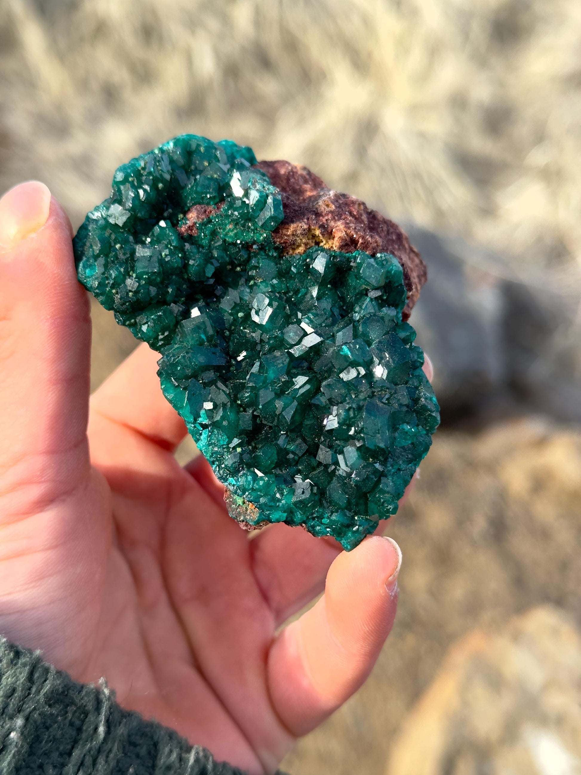 This is a really great specimen of vibrant Dioptase on matrix. Being “on matrix” simply means that it is still on the host rock. This type of specimen can be very desirable amongst collectors. Dioptase in general, is desirable because of its unique, beautiful, and deep blue-green color. This specimen in particular is from the “Sanda Hills occurrences” at the N’tola Mine, Mindouli, Mindouli District, Pool Department, Republic of the Congo. Gotta love a good matrix specimen!