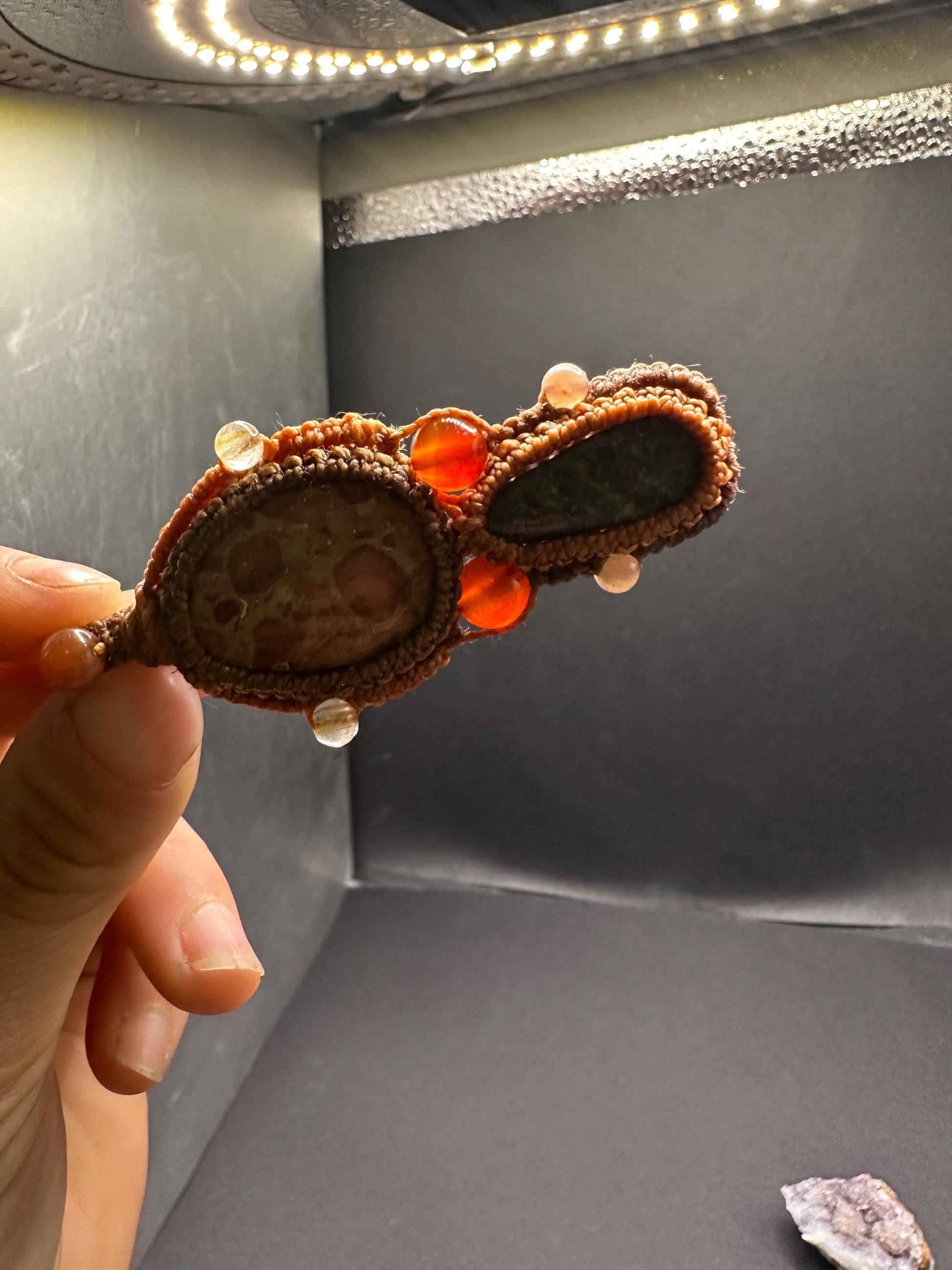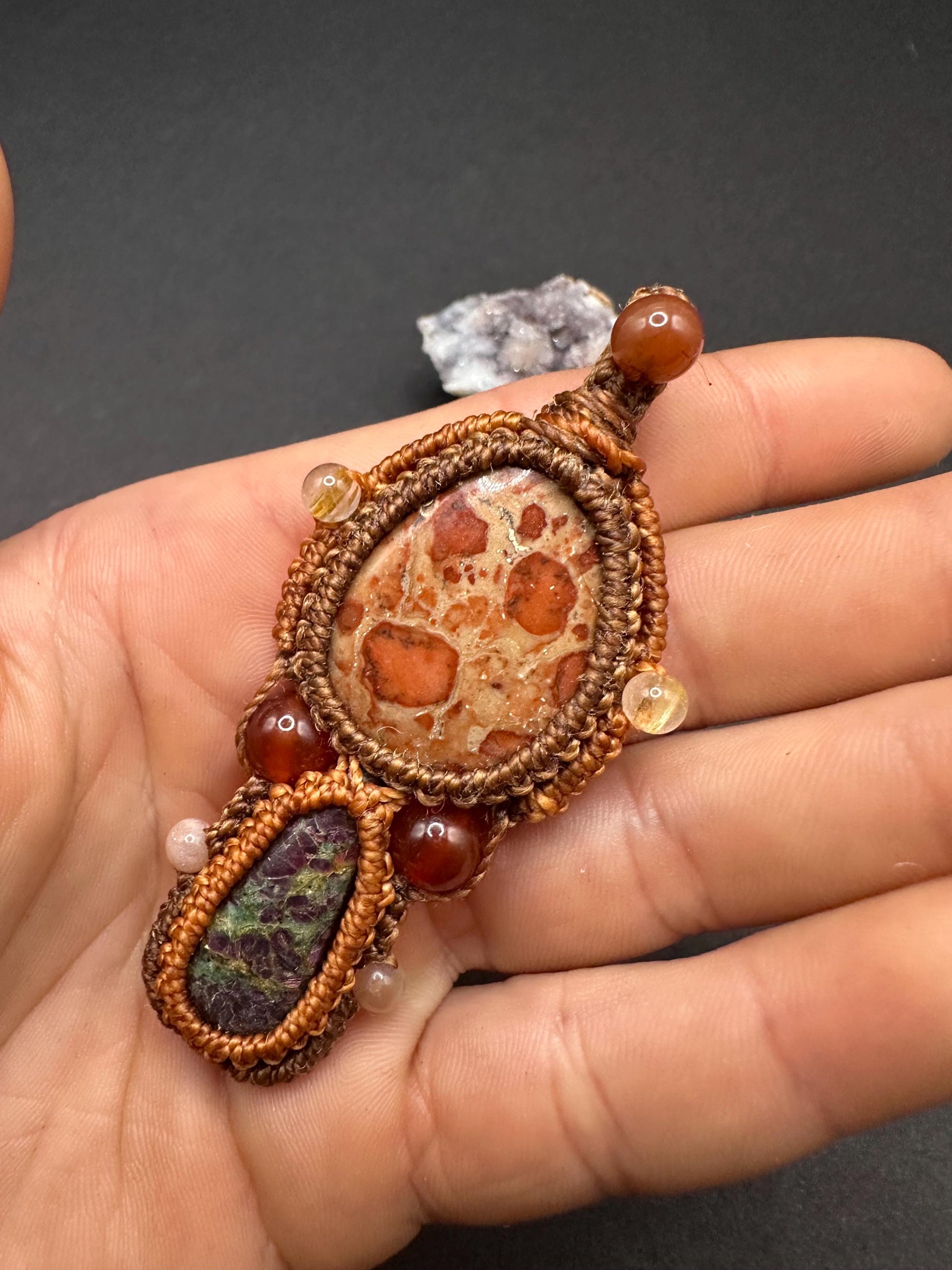 This macrame pendant is handmade with love. The stones are very carefully and mindfully chosen to provide a nice balance in color, and aesthetics.